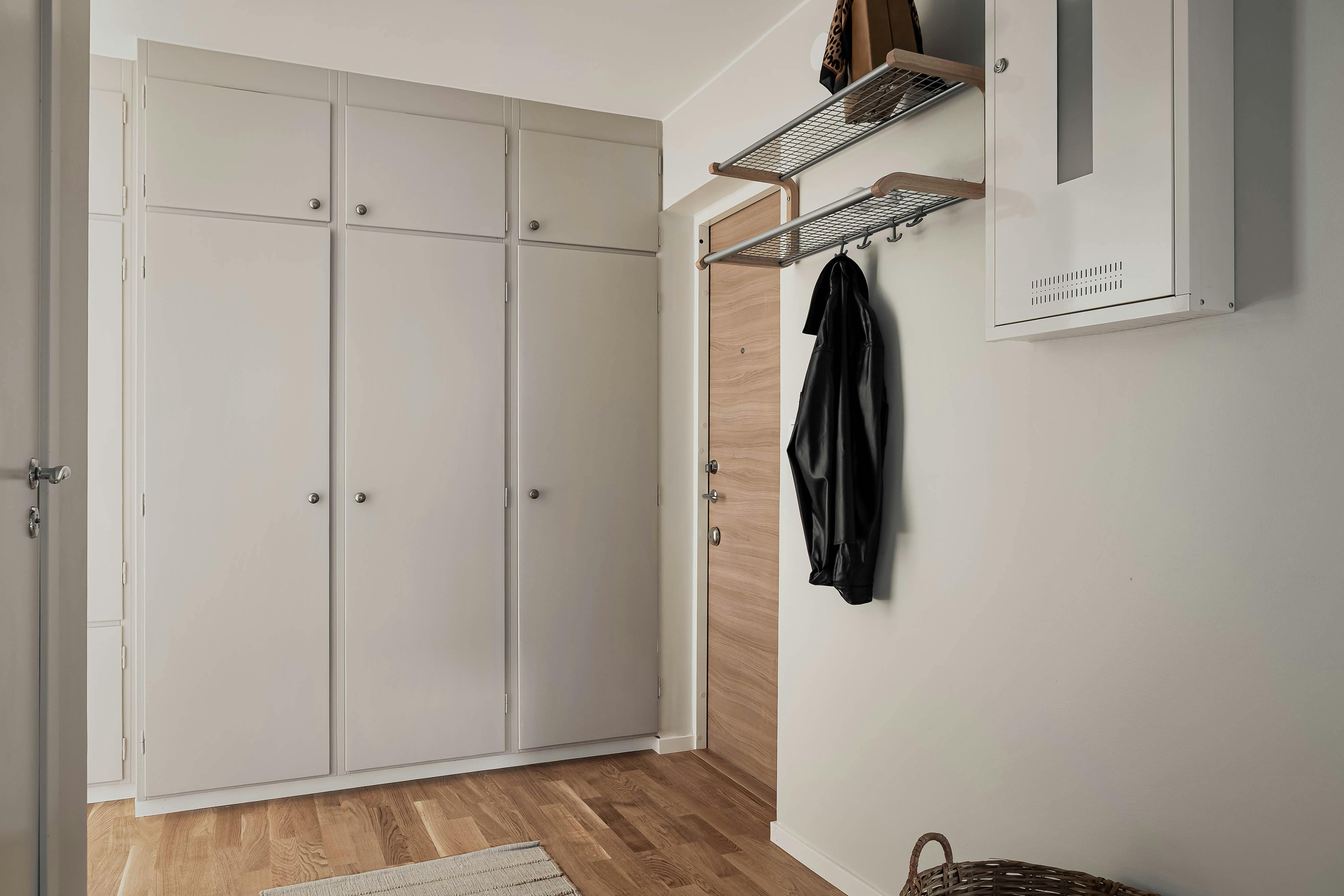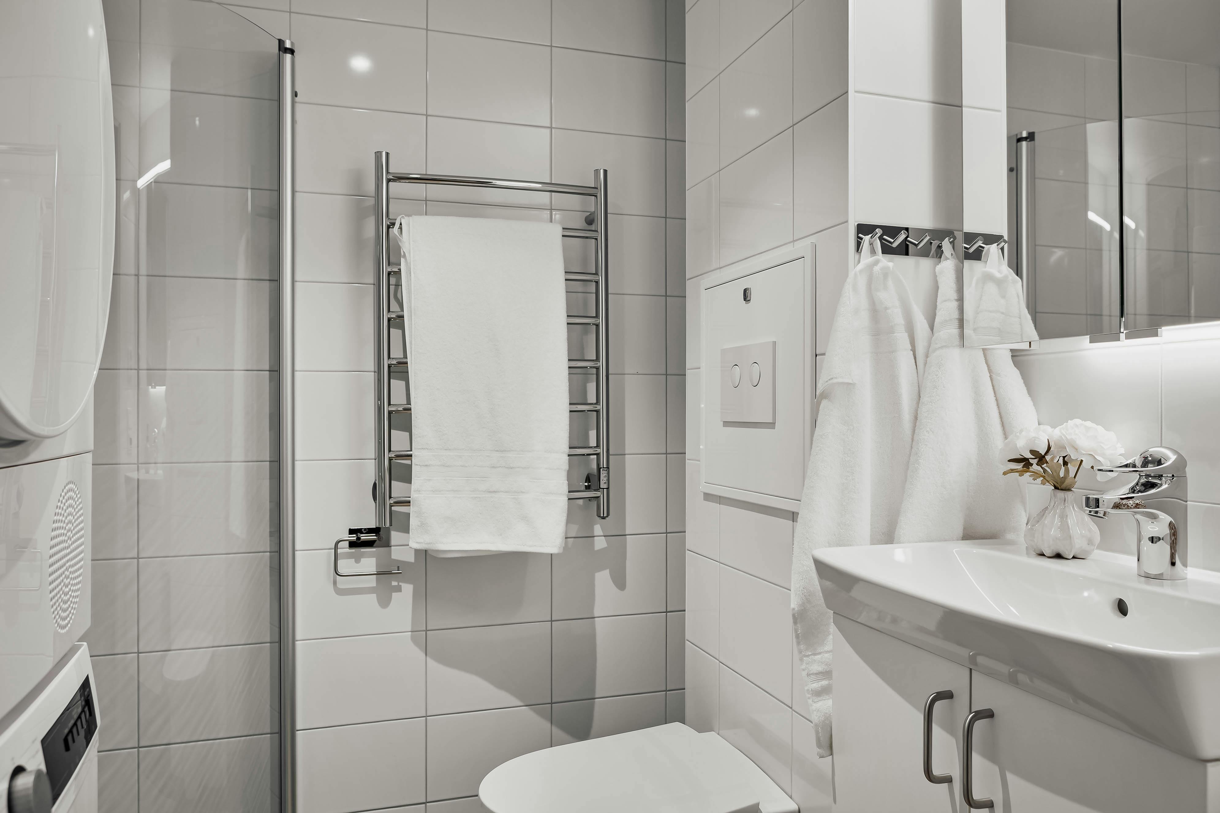- Badrum med kakel och klinkers, handfat med kommod, vikbara duschväggar, belysning i badrumsskåp samt handdukstork. Större lägenheter har tvättpelare, medan ettorna har kombimaskin.